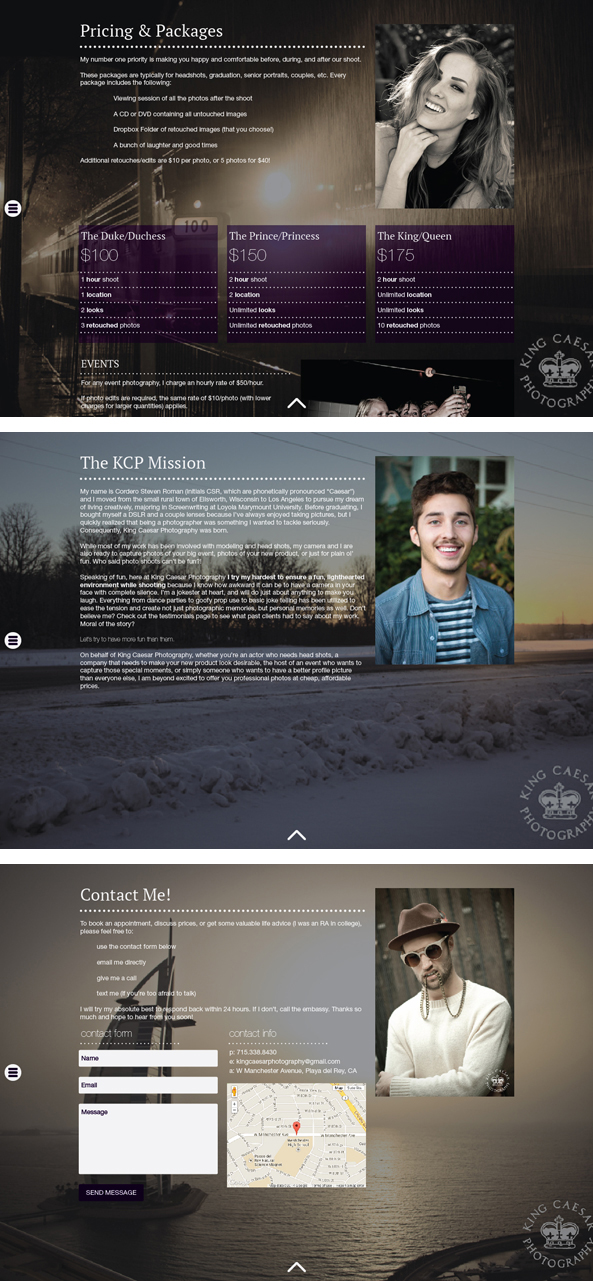 As a personal exercise, I decided to redesign a friend’s photography website. He began to take his photography more seriously, but I felt that his website was lacking. I set out to achieve two things: 1) Prevent obstruction of his photography, and 2) Make it look more professional. To make his photography the number one priority, I chose a design with full window photos as background and portfolio images (two images if portraits). Also, I wanted anything that wasn’t a photo (menu, footer, etc.) to have the ability to be hidden. Everything else fell into place on a 12-column grid. The first set (black and white) are the wireframes. Rectangles with “x” denotes a photography. The second set are high-definition wireframes, with pictures, font changes, color, and other aesthetics. His original site can be viewed (here).